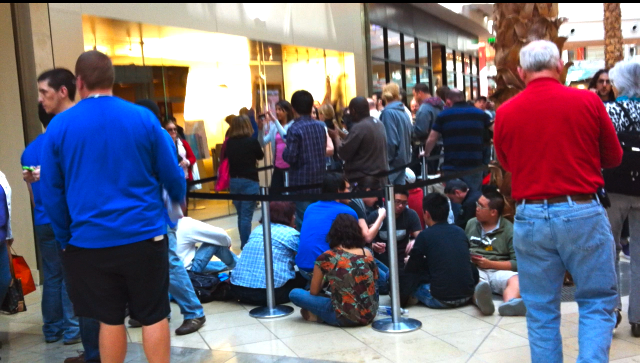 As we looked up, we noticed that throngs of people were gathering on the second level, just watching the madness. These Apple Release Days have truly become spectator events. And then, when we looked back, the line had grown and snaked its way to the end of the mall and danced a loop-dee-loo in the process.